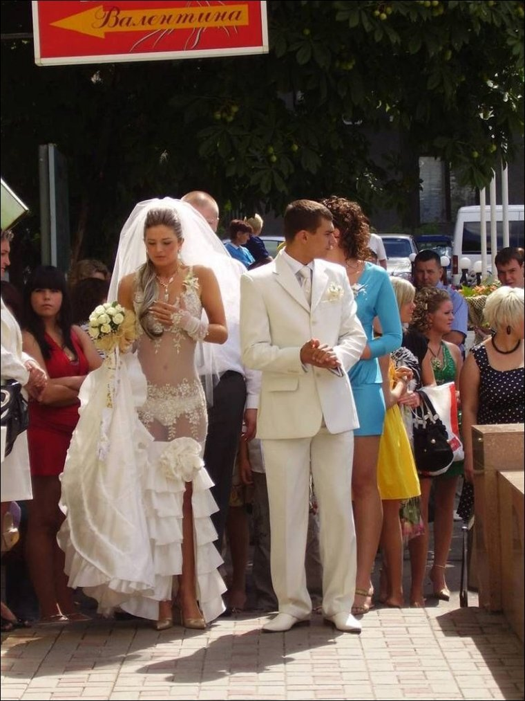 Каждый, кто хоть раз был на свадьбе, знает: свадебные фотографии — это не только милые улыбки и нежные обнимашки. Иногда на них появляются такие моменты, что хочется хохотать до слёз, а потом внезапно сгореть от стыда за креативный подход молодожёнов, разгулявшийся фотошоп или неудачно пойманный кадр. В этой подборке — самые яркие снимки, которыми гордиться не всякая пара решится, но равнодушным они точно не оставят никого! *** Смотрю на эту фотографию и теряюсь в догадках: то ли это задумка дизайнера в стиле “меньше — значит больше”, то ли свадебная мода резко ушла в сторону креатива. Впрочем, выражение лица невесты намекает, что что-то явно пошло не по плану (мама, нитку с иголкой срочно!).