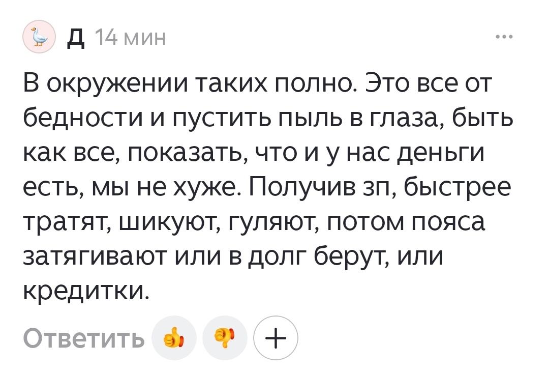 Доброе утро, друзья! Продолжим развивать вчерашнюю тему про кредиты и кредитки? Наикрутейший комментарий прилетел под постом: Действительно, давайте оглянемся вокруг, "пустить пыль в глаза" - это любимое у нашего народа. Я - миленниал, мне 38 лет. В этом возрасте ты или что-то из себя представляешь, или где-то на дне. Мы уже взрослые, имеем за плечами жизненный опыт, но при этом ещё вполне работоспособны. Мы "меряемся" квартирами, машинами, дачами, должностями на работе, достижениями наших детей. И от этого никуда не деться, таков социум. Хочешь не хочешь, всё равно сравниваешь себя с другими. Однако, кто-то прям ставит себе цель быть лучше Машки, Петьки или кого-то там еще, из кожи вон лезет, чтобы обскакать соперника. Поэтому тратит деньги на вещи получше, чем у него, на машину покруче. И хорошо, если свои кровные тратит, но ведь большинство в кредитах сидят, проценты бешеные отдают банку. Разумно это? Нет. А думает об этом кто-то из них? Сомневаюсь. "Машка чуть от зависти не з