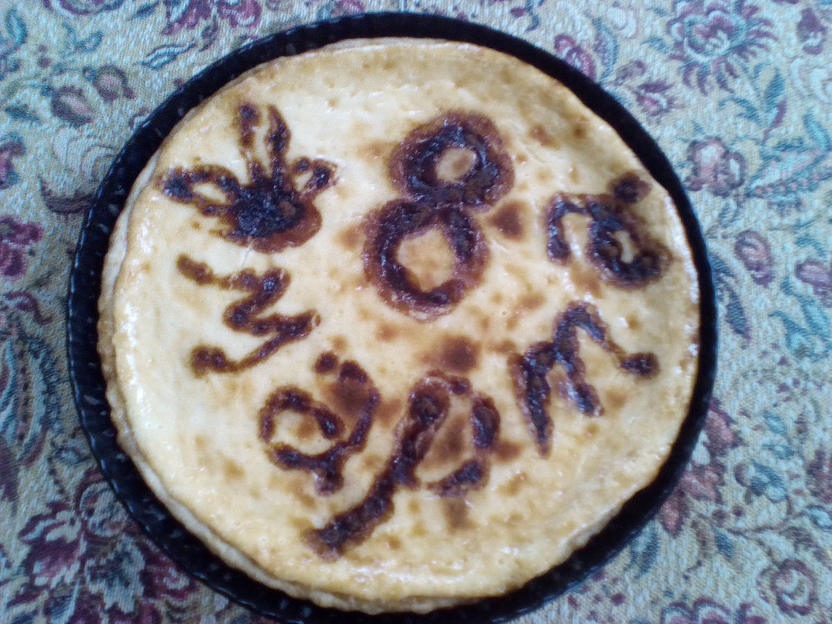 Здравствуйте, дорогие друзья! Одна моя подруга очень любит сладкое. Если вы тоже сладкоежки, делюсь с вами рецептом вегетарианского чизкейка. Вам понадобится: Начинка: Муку, соль, соду, масло растопленное растираем в крошку, добавляем воду и замешиваем тесто. Нужно раскатать тесто на диаметр вашей формы. Выложить лепешку в форму, выровнять бортики. Смешать сгущенку со сметаной, вылить в форму. Сверху посыпать цикорием (можно нарисовать какой-нибудь узор или надпись к празднику). Ставим в духовку 180° и держим чизкейк 50 мин. После этого нужно хорошо охладить. Время в духовке зависит от толщины слоя. Приятного аппетита!
