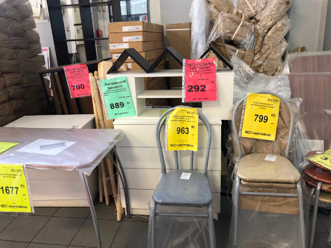 Всем большой привет! Сегодня снова заглянула в магазин Светофор и была приятно удивлена — в продаже появилось много интересных товаров для дома, а самое главное — сейчас действует распродажа на мебель и пластиковые окна. Решила подробно рассказать, что удалось увидеть и какие цены сейчас действуют, чтобы вы могли сориентироваться и, возможно, успеть воспользоваться выгодными предложениями. Начну, пожалуй, с того, что сразу бросилось в глаза — новая партия кухонных столов и стульев. Столы стоят на прочных металлических ножках, а столешница выполнена из ЛДСП коричневого цвета. Размер стандартный — 115 × 59 см, высота — 75 см. Выглядят аккуратно, подойдут для небольшой кухни или дачного домика. Цена сейчас вполне доступная — 1677 рублей. К столам отлично подойдут кухонные стулья, которые также представлены в ассортименте. Есть два варианта: обычные по 799 рублей и с усиленным металлическим каркасом — по 964 рубля. Сиденье выполнено из экокожи, выглядит аккуратно, легко моется, а нагр