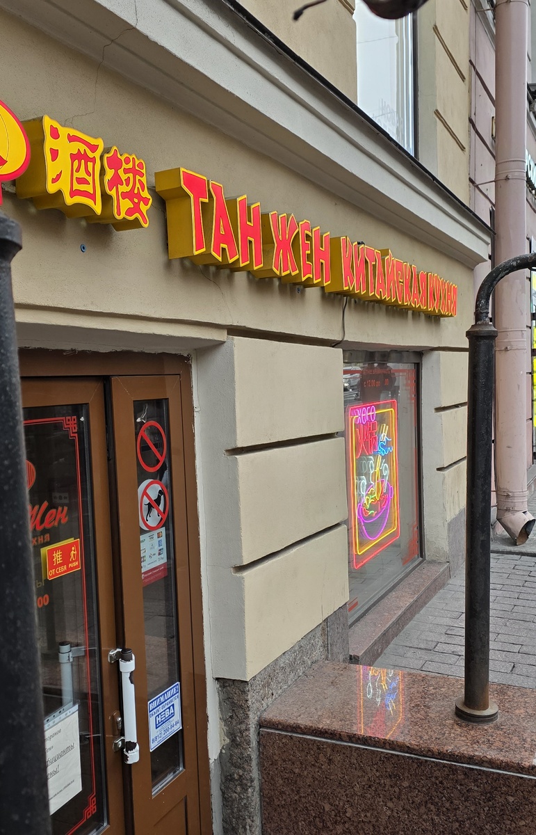 Ну так и тянет меня в азиацкую кухню... Изначально, мы шли слушать орган, но пока мы наслаждались творениями Баха, то изрядно замёрзли. Выйдя на улицу, нас встретил ледяной ветер, который кричал нам, что надо спрятаться в тёплое место. Хотелось и есть, и принять чего то согревающего, я вспомнила, что видела по дороге Тан Жен, представила курочку в кисло-сладком соусе и все, ноги уже сами несли нас на встречу гастрономических приключений. Вход в ресторан не особо примечательный, но если идти целенаправленно, то точно найдёшь и не пройдёшь. Первый зал очень атмосферный, но тёмный для красивых фоточек. По этому, не судите их строго. Столики на разные компании и есть детский уголок. Столы сервированны приборами, салфетками, соусами и специями. Все, как везде. Меню мы листали долго, есть картинки и указан вес порции, но я что-то сомневаюсь.... Мы заказали три блюда и бутылку вина, естественно, его и принесли первым. Из блюд, первым принесли баклажаны и они просто взорвали все наши вкусо