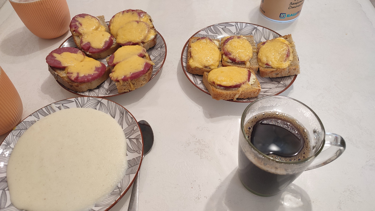 Всем приветик, мои дорогие 🤗. Мне часто пишут, чтобы мы подавали на детские пособия. Да, знаю, доход у нас не очень большой, но на пособия не проходим. Это как с ипотекой, только наоборот. На сколько-то превышение, поэтому- отказ. Итак, выходные дни пролетили, а мы и глазом не успели моргнуть. Ну это всегда так😄. Почему то каждый раз, когда собираюсь выспаться в субботу, после рабочих будней, что-то идёт не так. Например, сначала не могла заснуть, лежала часов до двух. А проснулась ещё когда шести не было. Лежала недолго. Получилось поспать минут 30. Ну всё, я не выспалась, и теперь злая. Завтрак даже готовить не хочу. Пусть про это думает муж. Муж предложил детям горячие бутерброды. Дети согласились, только дочка сказала, что хочет ещё и кашу. Мы без каши никуда 😄. Вот так выглядел наш завтрак. После, мы поехали на рынок, искать полосатую футболку, колготки или гольфы. Ничего нет. Ладно, я уже нашла выход. Куплю жёлтую футболку, и пришью чёрные ленточки. На работу мне н