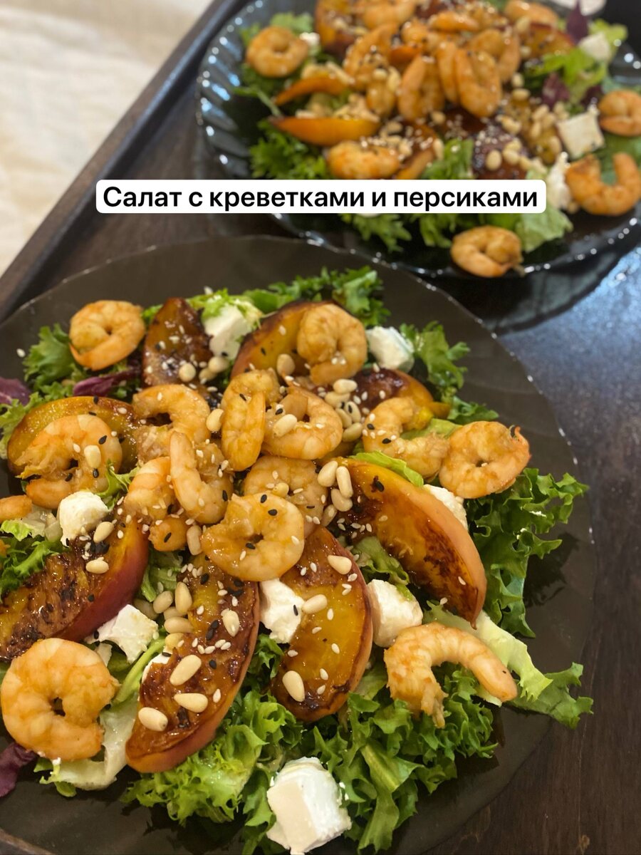 Потребуется: микс салата, креветки королевские, персики, сиртаки или фета, апельсин, мед, соевый соус, чеснок и кедровые орешки 1️⃣королевские креветки разморозить и очистить 2️⃣для соуса: соевый, сок половины крупного апельсина, капелька мёда, чеснок (натереть на мелкой тёрке) 3️⃣(я накосячила долгой жаркой, вы этого не делайте) пожарить креветки, достаточно 4 минуты! Отложить 4️⃣половину соуса потушить. В загустевший соус добавить креветки и оставить схватываться с соусом. После отложить 5️⃣персики тонко порезать и пожарить с 2х сторон до золотистости 6️⃣выложить салатную смесь, далее сыр сиртаки (или Фету) полить остатками соуса 7️⃣выложить персики и креветки, посыпать кедровыми орешками (они тут очень в тему) и кунжутом Так же сюда подойдут соусы: Манговый Терияки Унаги Экспериментируйте, это классно❤️