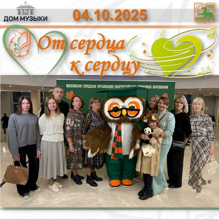 🎸04 октября 2024 года, накануне Дня учителя, члены ППО ГАОУ Школа «ШИК 16» А.В.Бадовская, В.В.Пименов, Л.О.Рогозина, Л.А.Смольянинова, Т.В.Сукретная и ветеран педагогического труда Г.Х.Фаттахова были приглашены МГО Профсоюза образования в числе московских педагогов на праздничный концерт «От сердца к сердцу» с участием группы «Моральный кодекс» и хора Пятницкого в Московский международный Дом музыки «Знакомые с детства песни и музыка, под которую так хочется танцевать в исполнении любимых артистов! Встречи, поздравления и атмосфера настоящего праздника! Председатель МГО Профсоюза образования Константин Гужевкин поздравил собравшихся с профессиональным праздником. Профессор Сов — мудрый наставник и символ МГО Общероссийского Профсоюза стал настоящей звездой вечера!» 🦉 📷Фотографии с праздника будут загружены в фотоальбом #ПРОконцерт #mgoprof
