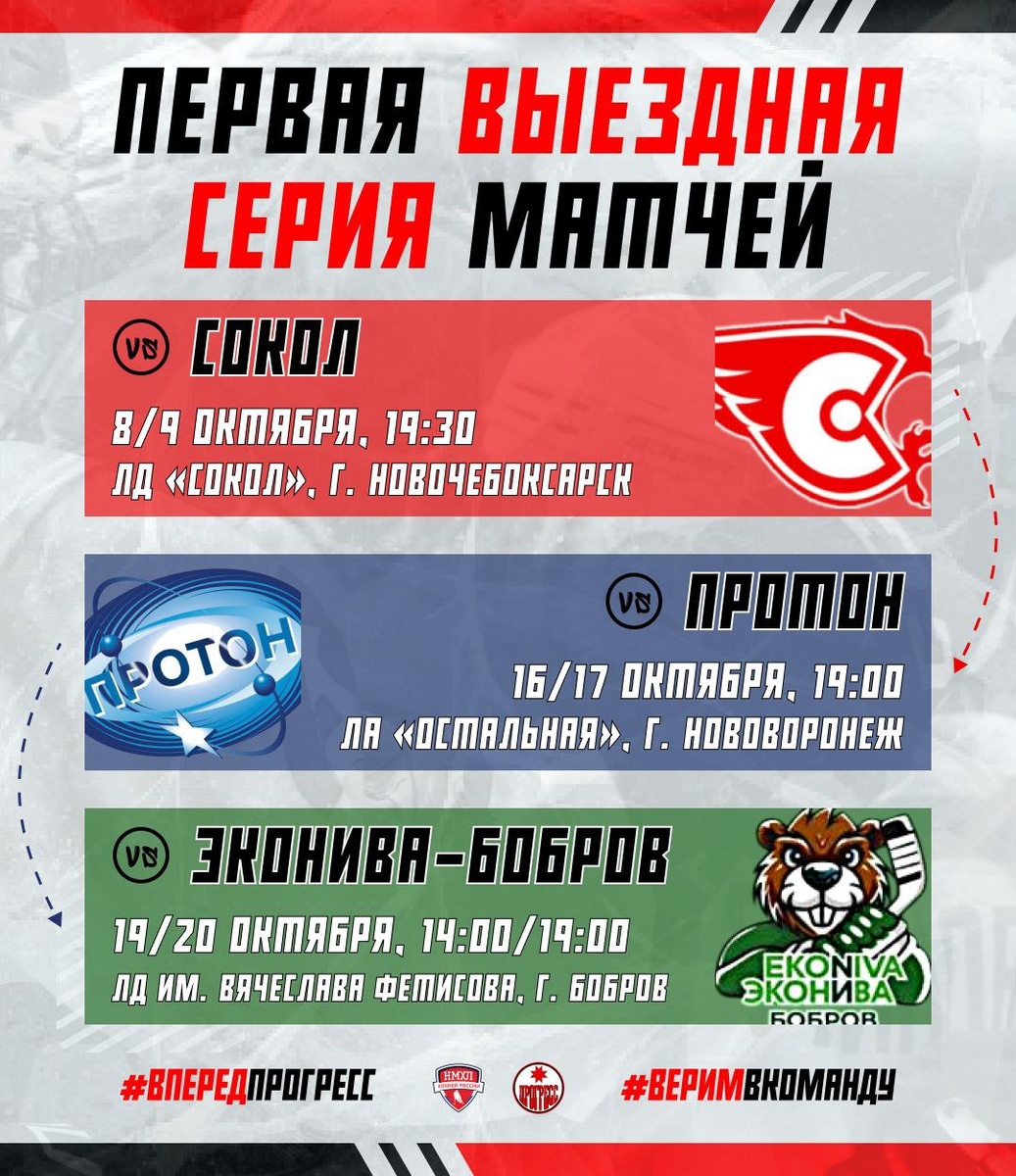 🚀 НАЧИНАЕМ ПЕРВЫЙ ВЫЕЗД! Готовьтесь к ярким хоккейным баталиям вместе с командой «Прогресс»! Уже совсем скоро команда отправится в насыщенный тур, полный эмоций и захватывающих моментов. ✔ 8 и 9 октября: встреча с грозным соперником — ХК Сокол, в городе Новочебоксарск. Матчи стартуют ровно в 19:30 по глазовскому времени. Поддержим наших ребят громкими криками болельщиков! ✔ 16 и 17 октября: наша команда проверит свои силы с ХК Протон, Нововоронеж. Начало поединков — в 19:00 по глазовскому времени. Покажем, насколько сильна поддержка нашего города! ✔ Завершаем поездку в городе Бобров, где встретимся с достойным оппонентом — ХК ЭкоНива-Бобров. График встреч следующий: 19 октября матч стартует в 14:00, а 20 октября — в 19:00. Готовьте позитивные эмоции и заряд бодрости! Пусть каждый матч принесет яркие моменты и долгожданные победы! 💥 #ВпередПрогресс #Победабезгранична #ПоддержимНашихГероев