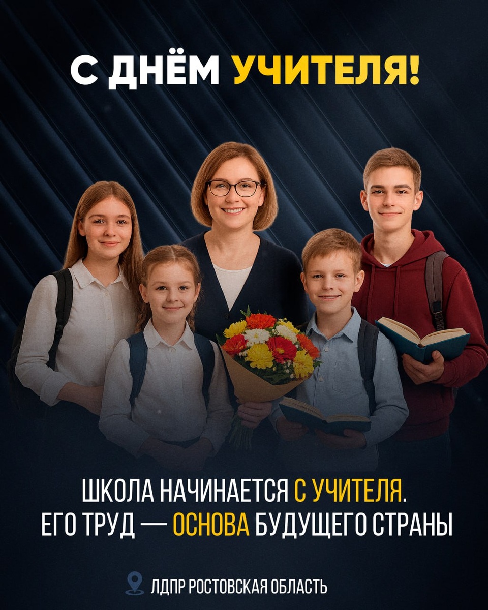 С Днём учителя! 🇷🇺 5 октября в России отмечается праздник тех, кто посвятил себя воспитанию и обучению детей — День учителя. Это один из самых значимых профессиональных праздников, ведь учитель формирует будущее страны, передаёт знания, ценности и любовь к Родине. ➡В Ростовской области трудятся более 35 тысяч педагогов, обучающих свыше 450 тысяч школьников в более чем 1100 школах региона. Учителя Дона неизменно демонстрируют высокий уровень мастерства, становятся лауреатами всероссийских конкурсов, вносят огромный вклад в развитие образования и воспитание детей. Особая гордость Дона — победы педагогов в конкурсах профессионального мастерства. За последние годы ростовские учителя не раз становились лауреатами всероссийского конкурса «Учитель года России», а педагоги сельских школ показывали уникальный опыт работы в условиях малокомплектных классов. Всё это подтверждает: на Дону работают настоящие профессионалы, чей труд ценится не только в области, но и на федеральном уровне. ✨✨✨Р
