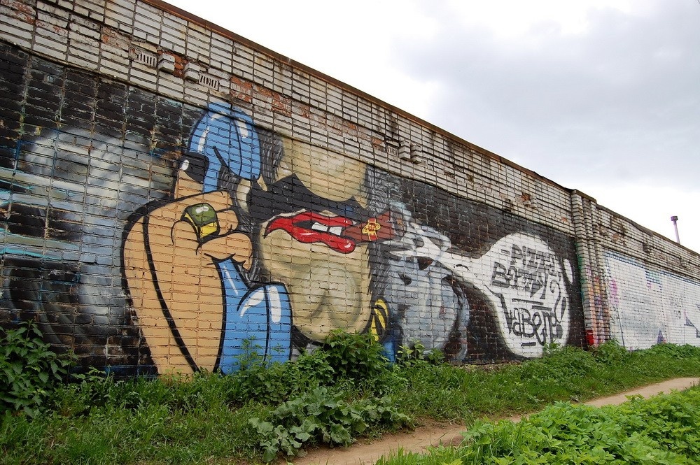 Рисовать на стенах всякое - однозначно нехорошо. Никого не радуют караки-мараки на стенах, даже если они складываются во вполне осмысленное и даже, не побоюсь этого слова - художественное изображение, именуемое граффити. Мы знаем Бэнкси и не знаем множество других, не менее интересных авторов - эта картинка, в Королеве, что под Москвой, отсылает к известному мультфильму и, попутно, к нашим восхитительным реалиям: