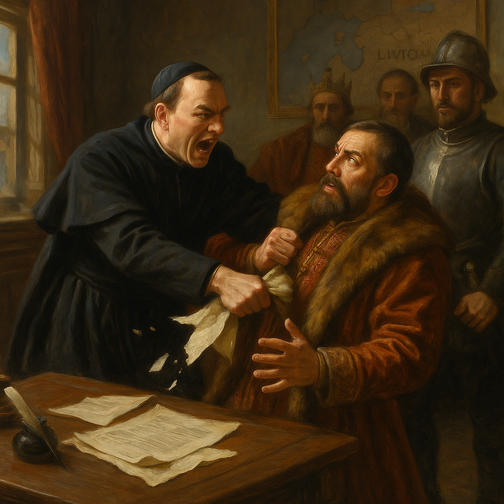 Переговоры были напряженными, но один эпизод вышел далеко за рамки протокола. В последней отчаянной попытке сохранить хотя бы тень присутствия в Ливонии, московские послы потребовали вписать в договор, что царь уступает Баторию... Ригу и Курляндию. Пикантность ситуации заключалась в том, что эти земли никогда Ивану Грозному не принадлежали.