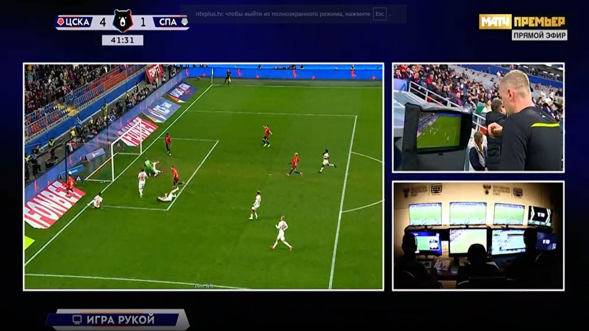 Правильное решение принимает арбитр ВАР Мешков и приглашает Чистякова на просмотр нарушения в начальной стадии атаки.