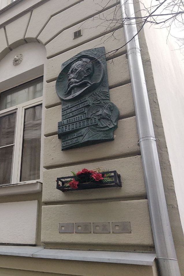 На фотографиях – Памятная доска Герою Советского Союза Оке Городовикову в Москве по адресу Большой Ржевский переулок,11, и автор у Памятной доски, 2024 год.