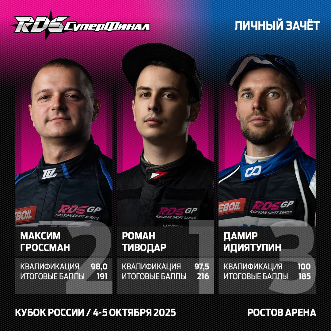Победители квалификации: 🏅 Дамир Идиятулин, FRESH RACING 🏅 Сергей Ермаков, STAR PЁR STARS AIMOL Личный зачёт: 🥇 Роман Тиводар, TAKAYAMA FORWARD AUTO 🥈 Максим Гроссман, TimeUp 🥉 Дамир Идиятулин, FRESH RACING Командный зачёт: 🥇 «TAKAYAMA FORWARD AUTO» 🥈 «FRESH RACING» 🥉 «TimeUp» 🤝 Весь дрифт обсуждаем в чате!