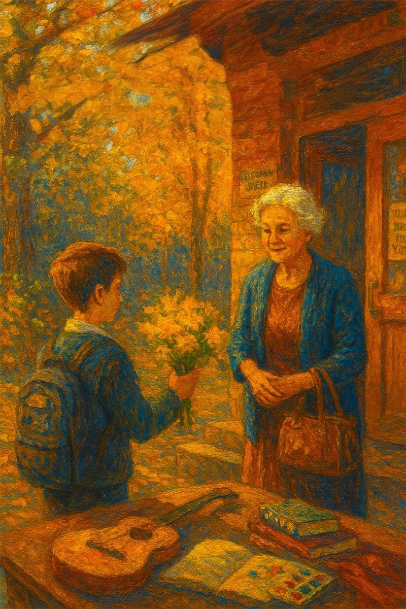 Осенний день, в воздухе кружатся золотистые листья. На крыльце старой школы стоит учительница – женщина с седыми волосами и с тёплой улыбкой. Её взгляд спокоен, но глубок, как озеро, в котором отражаются годы, книги и детские взгляды. К ней подходит ученик – мальчик с букетом жёлтых цветов. Он протягивает руку, и его взгляд полон восхищения. За спиной – рюкзак, а в душе – благодарность. На заднем плане – тёплые кирпичные стены школы, табличка «Неделя знаний» и деревья, шепчущие: «Она научила нас видеть мир». Это не просто сцена – это настроение: свет, память и тихое величие тех, кто не требует аплодисментов, но меняет судьбы. It is an autumn day, and golden leaves are swirling in the air. A teacher stands on the porch of an old school – a woman with grey hair and a warm smile. Her gaze is calm but deep, like a lake reflecting years, books and children's eyes. A student approaches her, a boy with a bouquet of yellow flowers. He extends his hand, his gaze full of admiration. Behind him