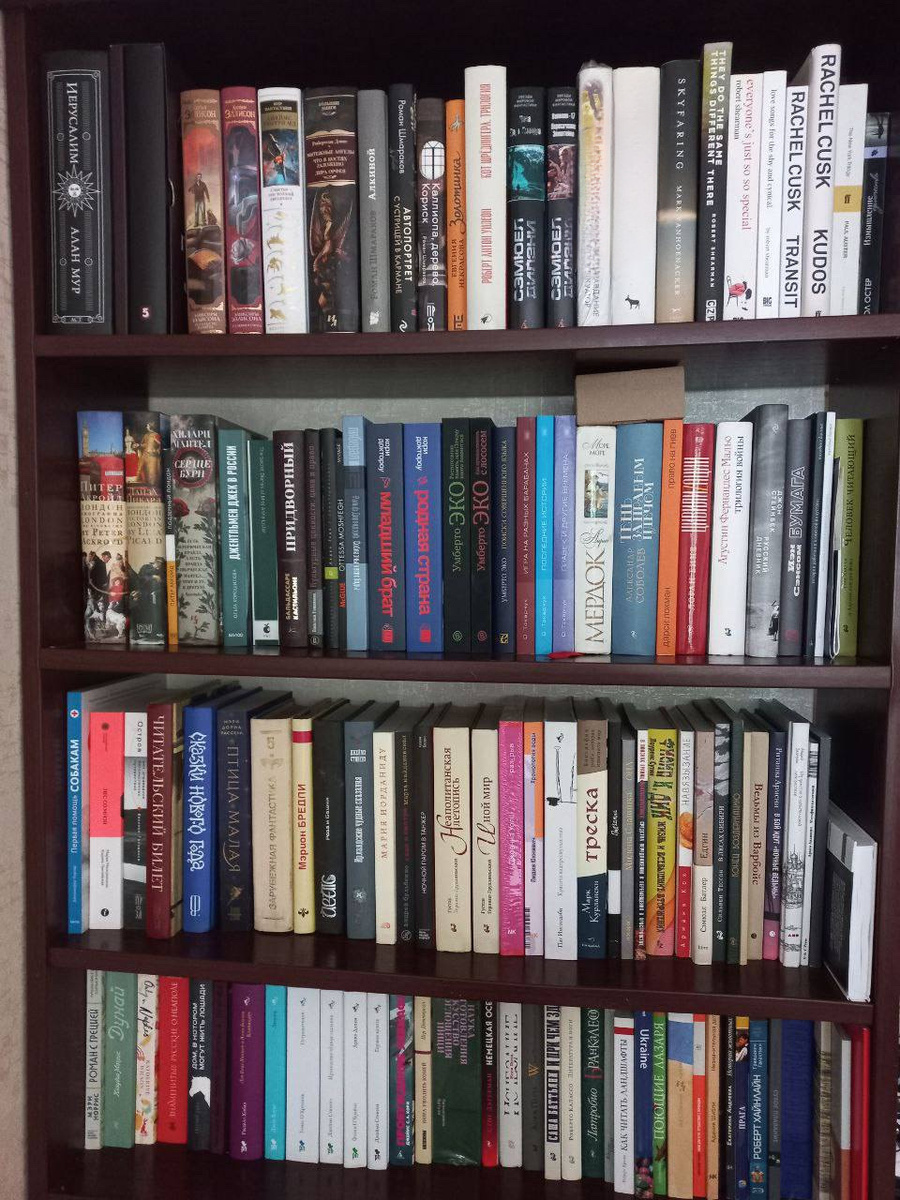 Сейчас в моей личной библиотеке 807 книг — я веду строгий учёт и знаю где лежит каждая и кому что дала почитать. Даже полки носят свои названия: “Прочитать срочно, желательно вчера” (это уже шкаф), “Моя работа: редактура и мои книги/журналы со статьями”, “Издательское дело и книги о книгах” и т.д.