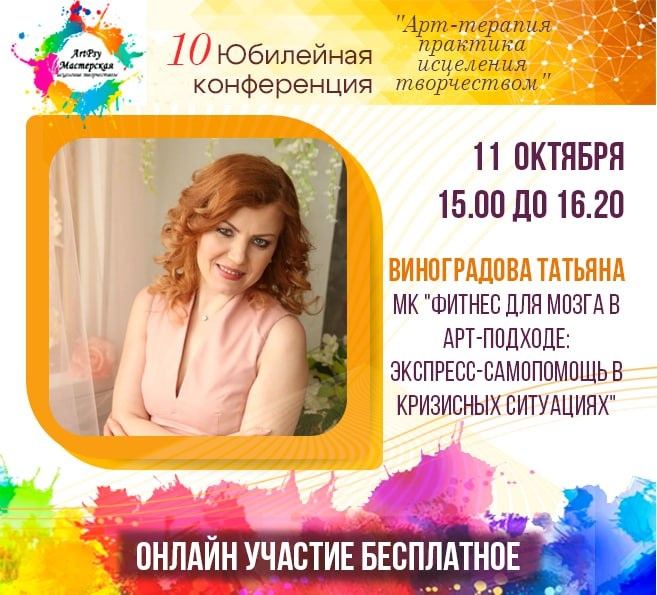🎨 МК "Фитнес для мозга в арт-подходе: экспресс-самопомощь в кризисных ситуациях" " Время: 11 октября 15.00 - 16.20 ⭐️Спикер: Татьяна Виноградова Психолог, коуч, игропрактик, автор метафорических карт и трансформационных игр, специалист по телесно-ориентированной терапии, тренер по йоге, специалист по аромадиагностированию. ✨ Участие бесплатное!!! Ссылка на регистрацию https://forms.yandex.ru/u/68adf277493639046ec1bc1b 🌸Также вы можете приобрести записи по ссылке https://artpsy.top/kh-yubilyeynuyu-konferentsiyu-art-terapiya-praktika-istseleniya-tvorchestvom Будем рады вас видеть⭐️