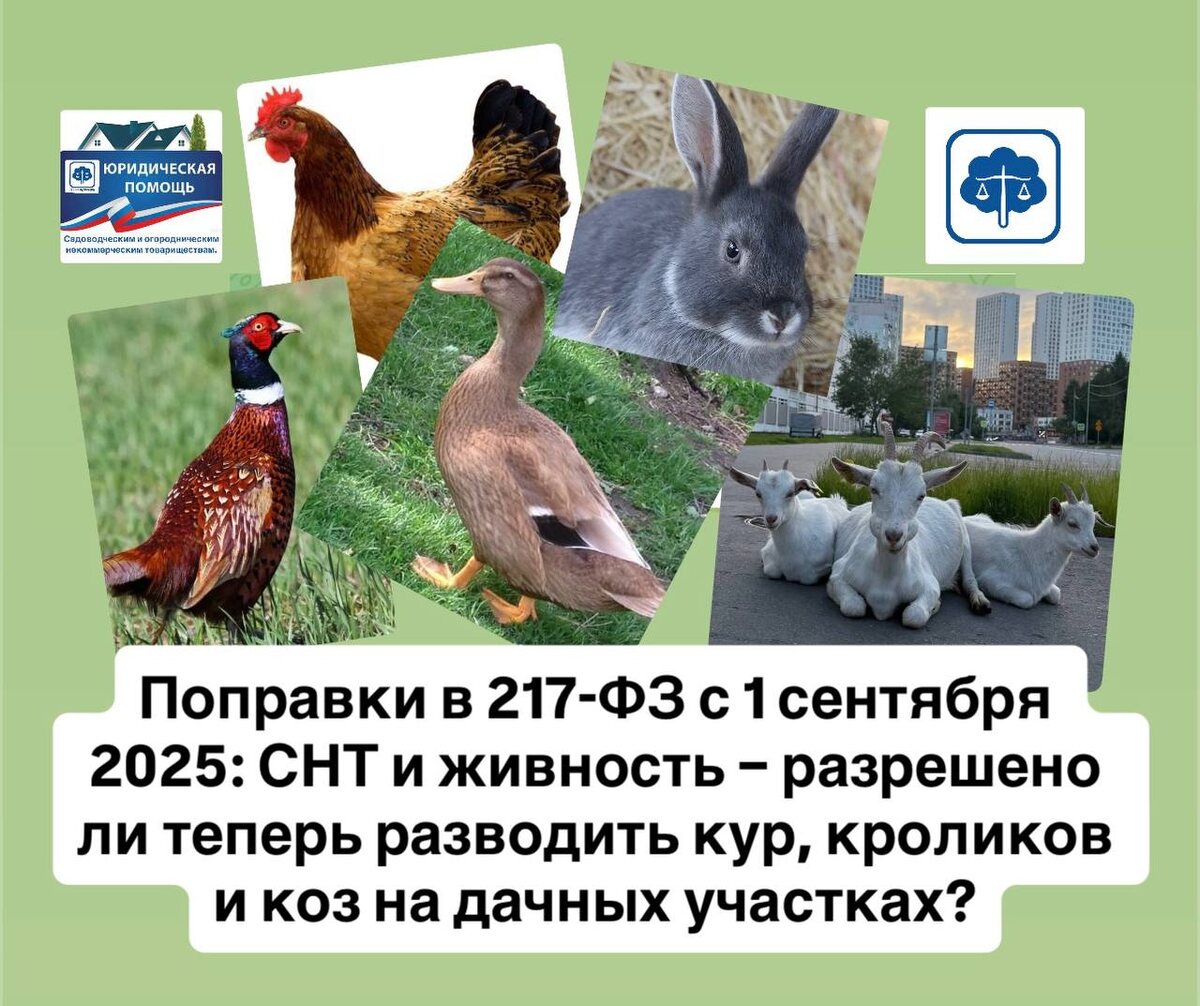 Что изменилось в СНТ с 1 сентября 2025: можно ли разводить кур, кроликов и коз? 🐔🐰🐐 С 1 сентября 2025 года вступили в силу изменения в Федеральный закон №217-ФЗ «О ведении гражданами садоводства и огородничества», внесенные Федеральным законом №353-ФЗ. 📰 СМИ пестрят заголовками о том, что теперь в СНТ можно держать не только кур и кроликов, но даже коз! 😄 Наши клиенты-садоводы буквально завалили нас вопросами, и мы решили подготовить подробную статью, чтобы вместе разобраться в новых поправках. 🧐 Что говорит закон? 🤔 Обратимся к тексту ФЗ-217. Статья 3 определяет садовый земельный участок как участок, предназначенный для отдыха граждан и (или) выращивания гражданами для собственных нужд сельскохозяйственных культур, сельскохозяйственной птицы и (или) кроликов в случаях, предусмотренных настоящим Федеральным законом. Получается, можно держать только кроликов и сельскохозяйственную птицу. 🐔 А к ней относятся не только куры, но и утки, гуси, фазаны и даже страусы! 🤩 Казалось