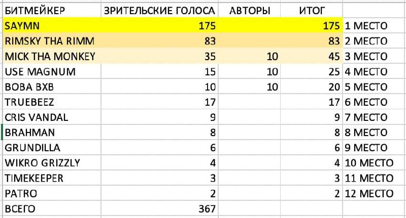 КОНКУРС БИТМЕЙКЕРОВ. ОФИЦИАЛЬНЫЕ РЕЗУЛЬТАТЫ. 1 МЕСТО - SAYMN @SAYMNBITODEL 🥇 2 МЕСТО - RIMSKY THA RIMM @Roma_familia 🥈 3 МЕСТО - MICK THA MONKEY @foreveryungwu 🥉 SAYMN умудрился победить в зрительском опросе с таким отрывом, что наши голоса погоды не сделали. Именно с ним мы будем выпускать трек в качестве главного приза! (Мы свяжемся по этому вопросу отдельно) А вот ВТОРОЕ место - и винил «ОПЕРАЦИЯ ДЖИ» - уходит Ромке РИМСКОМУ!!! Которую он может переуступить дальше по цепочке MICK THA MONKEY, на случае если ему не нужна вторая пластинка💀💀💀. 🍾🍾🍾Поздравления победителям и респект ВСЕМ участникам! 💪🏽💪🏽💪🏽