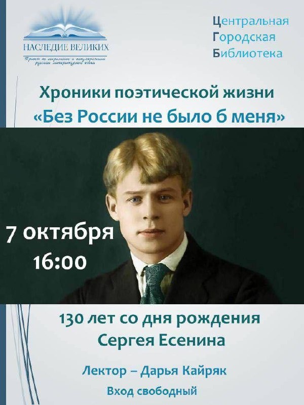 Хроники поэтической жизни “Без России не было б меня”, мероприятие на 130 лет со дня рождения Сергея Есенина в Центральной библиотеке Сочи 🗓 7 октября, 16:00 📍 Чайковского, 4 👥 Вход свободный 130 лет назад в селе Константиново Рязанской губернии родился будущий народный любимец - поэт Сергей Александрович Есенин. Его называли певцом русской души, всех её отражений – светлых и тёмных, высоких и приземлённых. Он воспел тягу к свободе и тоску по утраченной любви, красоту родной природы и трагизм эпохи. Его имя неразрывно связано с Россией. Вся его жизнь нашла отражение в творчестве - социал-демократические идеи, образы революции, родины, деревни, природы, любви и, конечно, поиск счастья. 📲 Афиша Сочи в МАХ