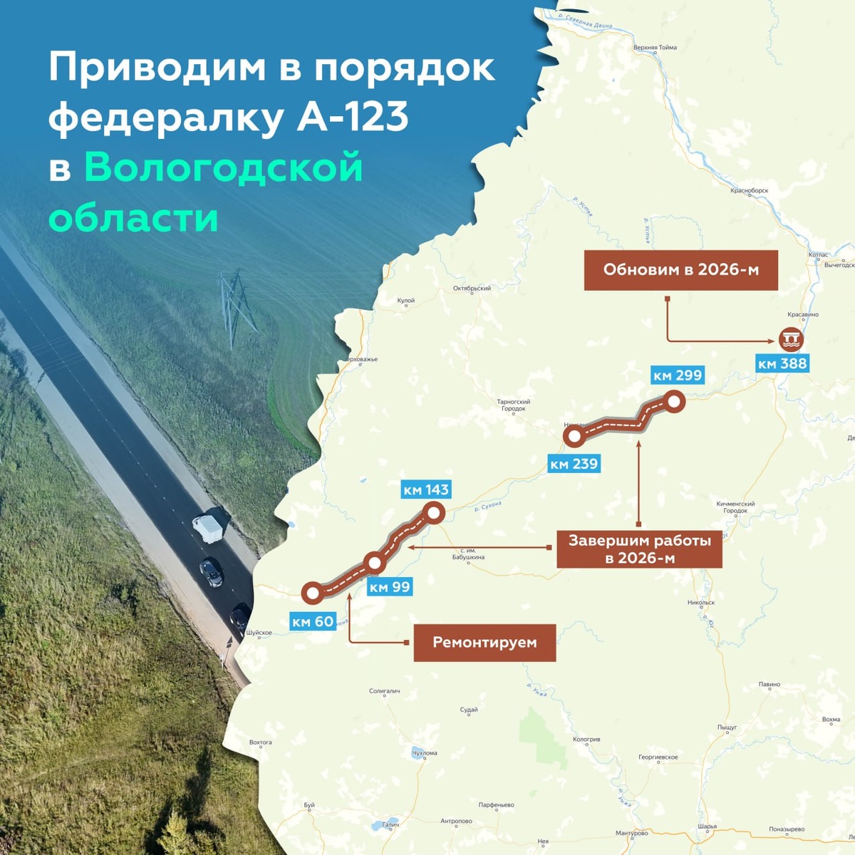 Обновляем 143 км трассы А-123 в Вологодской области Работы развернулись на нескольких участках. Так, с 60-го по 99-й км идёт активный ремонт — здесь скосили лишнюю растительность в полосе отвода и заменили водопропускные трубы, а с 72-го по 99-й км уложили новое покрытие. Позже заменим барьерку, обновим 12 автобусных остановок и разметку, дорожные знаки. На другом отрезке, с 99-го по 143-й км, устраиваем слои износа. Закончить этот объём планируем в следующем году. В перспективе продолжим повышать безопасность для пешеходов и водителей: в 2026-м приведём в порядок мост через Хайму, а в 2027–2028 годах устроим около 28 км тротуаров и 24 км линий освещения. 📍Федералка А-123 проходит по Вологодской и Архангельской областям, а также Республике Коми. Её длина — 665 км. Трасса открывает путь к Великому Устюгу, Тотьме и Нюксенице — местам с богатой историей, тесно связанным с торговлей и солеварением. Именно по А-123 можно добраться до вотчины Деда Мороза. #росавтодор_ремонт #идж