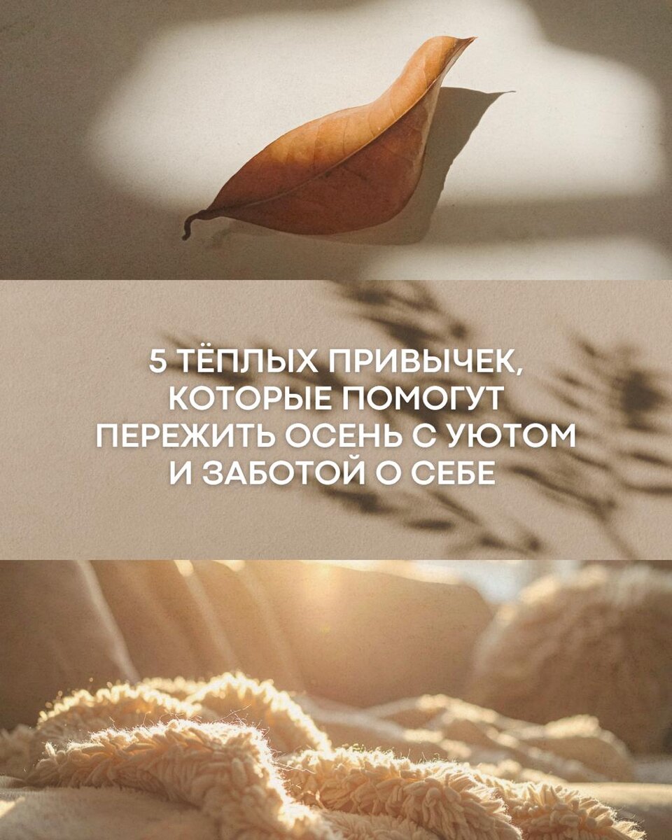 🍂 5 простых правил, чтобы заботиться о себе этой осенью 🔸Следите за режимом сна и отдыха. Осенью многим сложнее просыпаться и быть бодрыми. Старайтесь ложиться и вставать в одно и то же время, чтобы не выбиваться из ритма. 🔸Добавьте в рацион больше тёплой и сезонной еды. Тыква, тушёные овощи, супы, каши — всё, что греет не только тело, но и душу. 🔸Не игнорируйте движение. Даже короткая прогулка днём — это и поддержка для сосудов, и отдых для нервной системы. 🔸Уменьшите количество лишнего шума. Информационная перегрузка снижает устойчивость к стрессу. Введите «тихие часы» без новостей, гаджетов и перегрузки. 🔸Помните о поддержке организма. Осень — время, когда иммунитет и настроение особенно нуждаются в витаминах, тепле и заботе. Давайте себе это, по возможности. 📌 Сохраняйте себе — пусть это напоминание будет рядом в октябрьские дни.