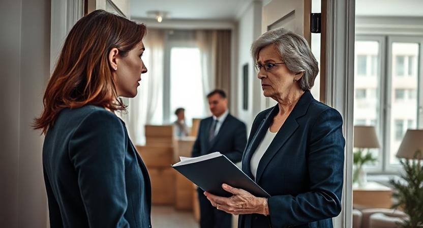 Вера Павловна стояла на пороге в своём лучшем костюме цвета морской волны, с папкой документов в руках и холодной решимостью в глазах. За её спиной маячили два крепких парня с коробками — явно грузчики.