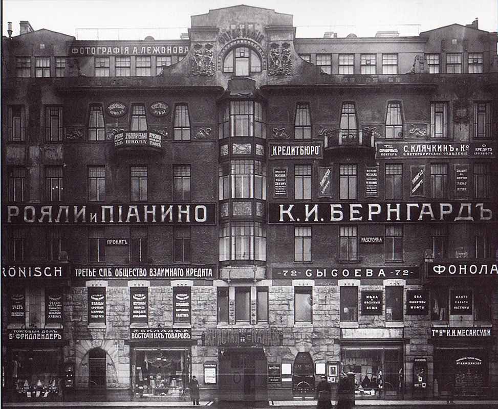 инотеатр из дворового флигеля В этот день, почти век назад (в 1929 г.) в Ленинграде в кинотеатре на Невском пр. состоялась невероятная премьера. Впервые был показан фильм со звуком. И показан этот фильм был в одном из старейших кинотеатров, который появился еще в дореволюционной России. История там была такая: В 1910 г. на этом месте возводится шестиэтажный прекрасный дом, сохранившийся и до наших дней. Это был типичный доходный дом для не самых бедных жителей дореволюционного Петербурга. Строил дом архитектор Минаш для жены полковника госпожи М.В. Воейковой. На старой фотографии фасада здания, можно увидеть, как много самых разных контор расположились в этом доме. И фотографы, и магазины, и склады, и микро-займы. Еще здесь находилась редакция эсеровской газеты «Дело народа». А во дворе дома во флигеле был сделан кинотеатр. Назывался «Кристалл Паласс». Надо сказать, что к тому времени (1910 год) Невский пр. уже практически «кишел» кинотеатрами и был главной «кинематографической» у