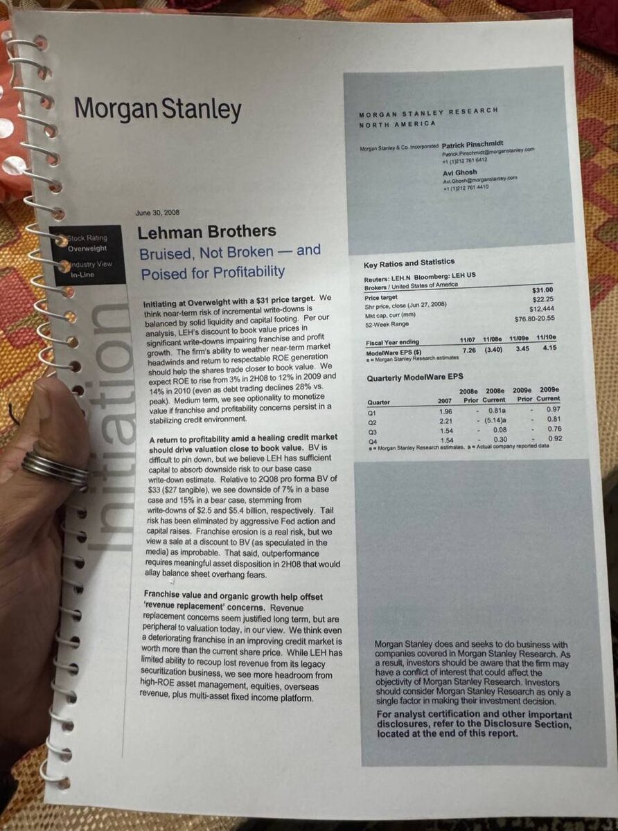 Когда пузырь лопается, но Уолл-стрит всё ещё улыбается На фото — отчёт Morgan Stanley от июня 2008 года. Заголовок: “Lehman Brothers — Bruised, Not Broken and Poised for Profitability.” Через три месяца Lehman обанкротился и запустил крупнейший финансовый кризис современности. Мораль проста: когда рынок начинает сползать, но ещё не рухнул — «аналитики» продолжают петь песни про «возможности для покупки». Почему? — им нужно сохранять оптимизм для клиентов, — или просто успеть разгрузить собственные позиции. Это и есть ловушка переходного периода — когда толпа всё ещё верит, а умные деньги уже выходят. Ключевая мысль: настоящие кризисы начинаются не с паники, а с самоуспокоения. Хотите, сделаю пост с самыми показательными примерами таких «бычьих отчётов перед обвалом» — от доткомов до 2022? Это поможет вам видеть, когда оптимизм становится опасным. #рынок #кризис #уоллстрит #психологияинвестора