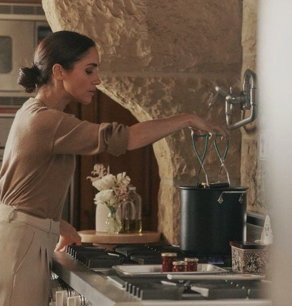 Давайте нарисуем картину. Меган стоит на тщательно убранной кухне, вероятно, где-то в Монтесито, в окружении банок, которые явно никогда не видели настоящей клубники. Её волосы — наконец-то собранны и аккуратно уложены в пучок после того, как весь мир обсудил причёску Кейт, принцессы Уэльской. Меган, как будто собирается провести мастер-класс по домоводству. Ну, вы знаете, ничто так не сближает вас с кухней, как бежевый кашемировый свитер и команда стилистов.