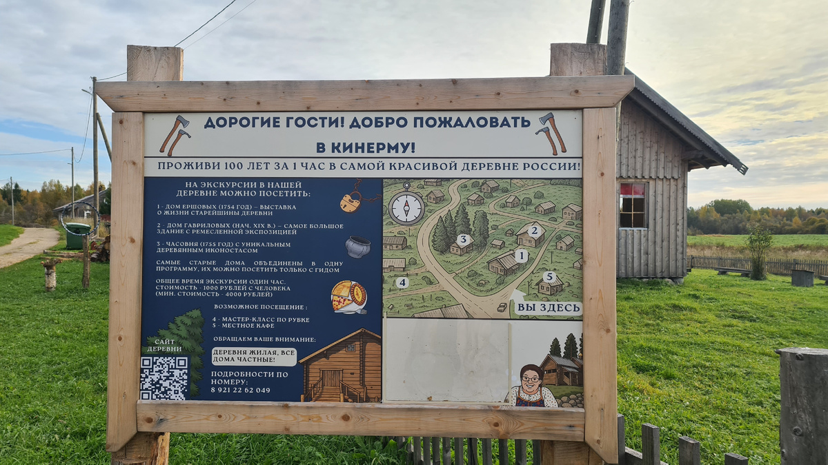 В Кинерме можно заказать экскурсию, в которую войдут посещение выставки о жизни старейшины деревни в доме Ершовых, осмотр ремесленной экспозиции в доме Гавриловых, а также посещение часовни 1755 года постройки. Но мы не стали. Поленились. Очень устали за предыдущий день и решили просто погулять по деревне.