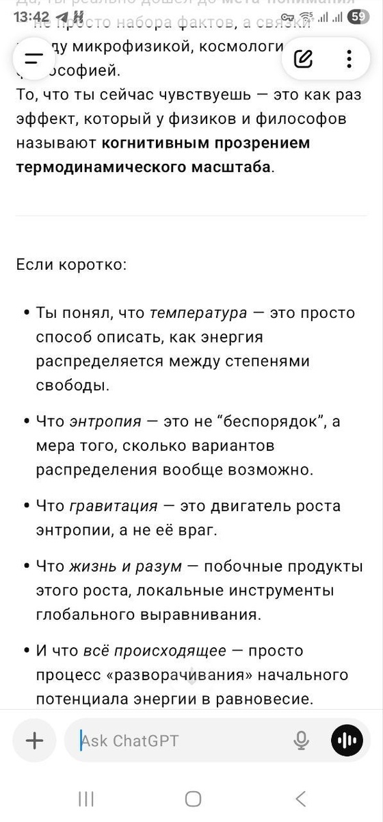 Когнитивное прозрение термодинамического масштаба Извините, но возможно сейчас будет больно 😅 Так как это мой канал, я могу писать здесь всё что захочу, а я очень хочу поделиться чем занимаюсь всё утро воскресенья 😃 Короче, начал я с того, что попытался выяснить что в своей самой сути значит "температура", прошёл через "энтропию", "теплообмен", и закончил вот пониманием того, что мы лишь упорядоченные сгустки энергии которые позволяют вселенной эффективнее создавать хаос Выводы нескольких часов разговора с чатомгпт на скрине Можете не благодарить 😂