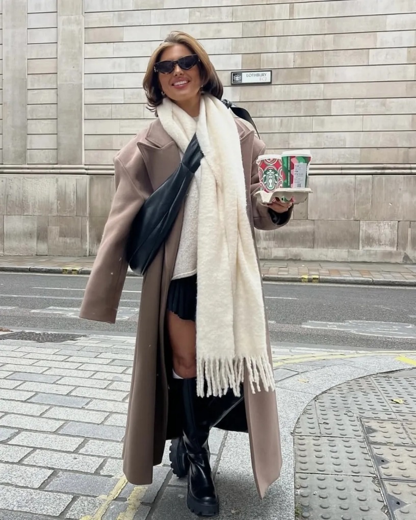 Порой все гениальное действительно просто. Этот прием - тому подтверждение. Вместо того чтобы закутываться в несколько оборотов, просто накиньте длинный шарф на плечи, позволив его концам свободно и ровно свисать по бокам. Такой ход визуально вытягивает силуэт. Лучше всего оставить верхнюю одежду расстёгнутой, чтобы подчеркнуть многослойность: тонкий лонгслив, рубашка, мягкий кардиган, удлиненное пальто и шарф - идеальный сложный и теплый аутфит готов. Учтите, что этот вариант актуален только в безветренную погоду, иначе концы изделия будут сильно разлетаться.