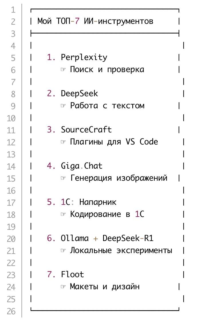 Мой ТОП-7 ИИ-инструментов, которые использую каждый день Когда был на стачке, принял участие в круглом столе «ИИ vs Аналитик» и по итогам Юля попросила скинуть список нейроинструментов которые я прям постоянно использую, решил, что раз уж пишу, то можно и пост из этого сделать 1. perplexity - Для поиска информации и анализа конкурентов, а так же для проверки своих материалов на полноту. Использую лабораторию для создания различных онлайн стендов 2. deepseek - для работы с текстом и различных бытовых задач, в которые не очень сильно хочется погружаться, мощная и при этом бесплатная альтернатива другим моделям 3. sourcecraft - Плагин для VS Code, который помогает экономить время при написании сиквенсов и openapi спецификации, а так же при написании любого другого кода или анализа его 4. giga.chat - Использую в основном для генерации картинок. Хотя функционально умеет очень многое (даже создание презентаций!), в качестве ответов пока уступает узкоспециализированным аналогам. 5. 1с:Напа