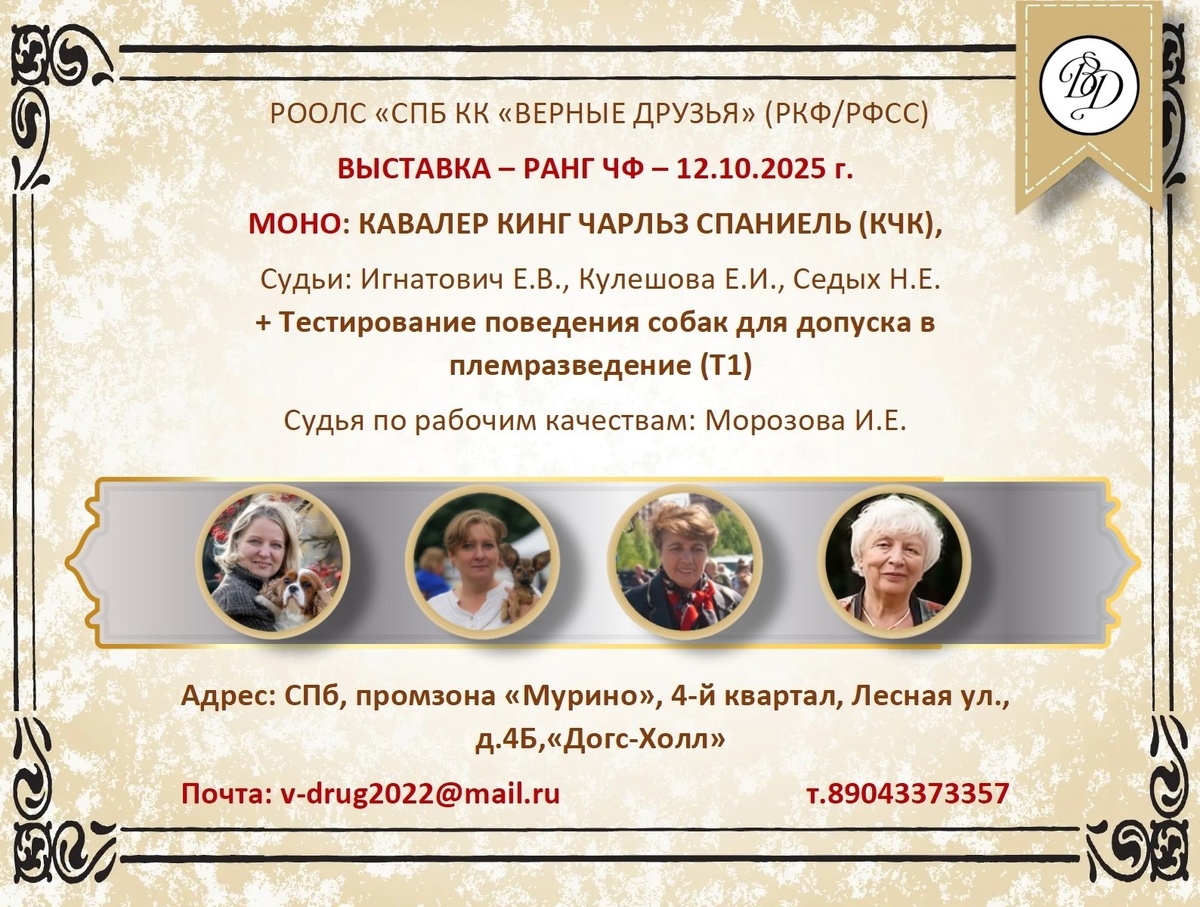⏰ 12 окт (7д) 🏛 #Петербург #Россия #Выставка 🐶 Выставка собак: Встреча верных друзей 🏆 Кинологический Клуб "Верные Друзья" Контакты организаторов здесь: 🌐 https://www.petsman.ru/vystavki-sobak.php?mesto=58-sankt-peterburg ✅Всепородная выставка -ЧФ (РКФ, РФСС) и ✅монопородная выствка: Кавалер кинг чарльз спаниель (КЧК) + Тестирование поведения собак для допуска в племенное разведение. Тестирование поведения собака проходит с 12 месяцев. Запись в класс "ЮНИОР" осуществляется, только, по РОДОСЛОВНОЙ. 🧑 👨 Эксперты: 🔹 КУЛЕШОВА Е. И. (СПб) 🔹 ИГНАТОВИЧ Е. В. (Москва) 🔹 СЕДЫХ Н. Е. (СПб) 🔹 МОРОЗОВА И. Е.