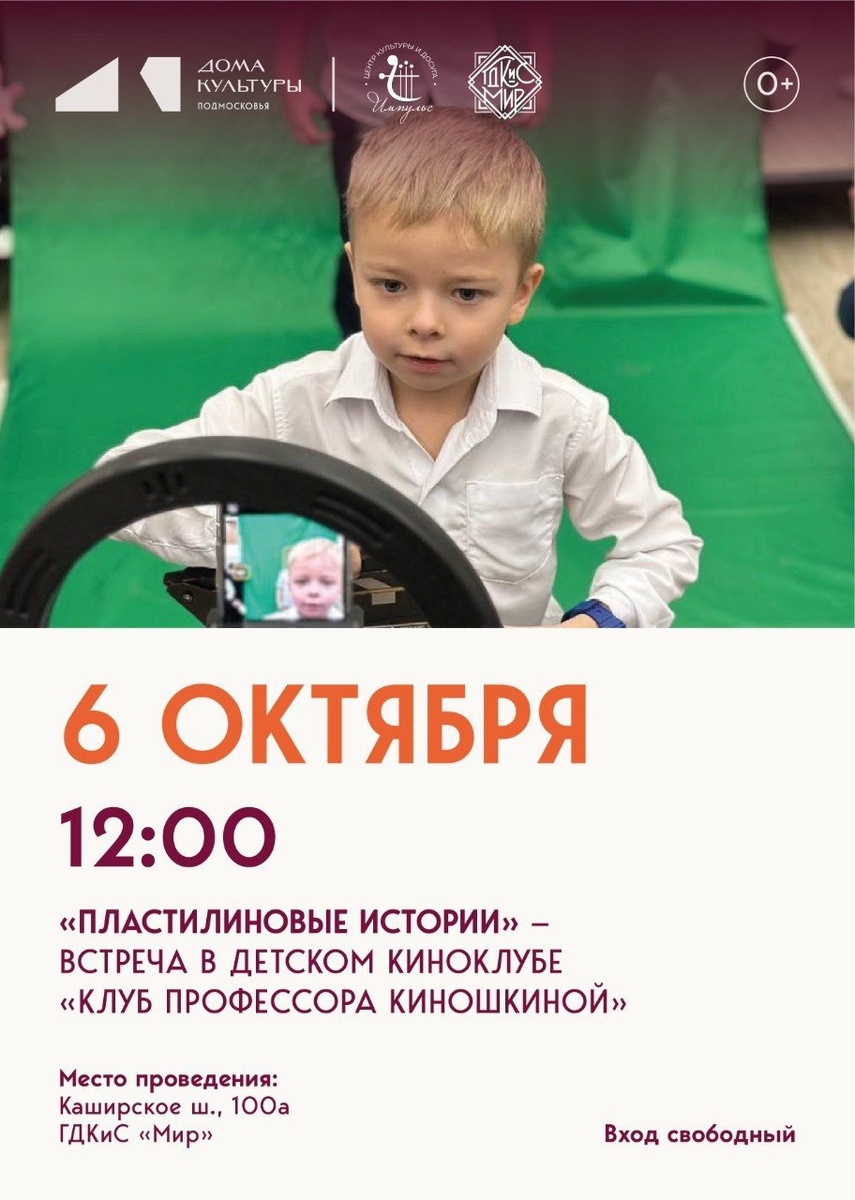 ✨ 🎉 ЗАВТРА! 🎉 6 октября в 12:00 приглашаем вас на встречу в детском киноклубе «Клуб профессора Киношкиной» — «Пластилиновые истории»! 🍃🎬 📍 Место проведения: Каширское ш., 100а, ГДКиС «Мир» 🎟️ Вход свободный! На программе вас ждут увлекательные истории о создании пластилиновых мультфильмов, а также возможность создать свой собственный пластилиновый видеофрагмент! 🎨✂️ Не упустите шанс погрузиться в мир творчества и фантазии! 🌟 Ждем вас! 🚫 Возраст: 0+ 📆 06.10.2025🕒12:00 🏢 Дворец культуры и спорта «Мир» 📍 г. Домодедово, Каширское шоссе, д.100А 💰 Вход свободный❗️ ✅ Мероприятия Домодедово https://dzen.ru/id/66f10385cc4c5a16f7b5fb02 http://vk.com/domodedovo_events http://dzen.ru/domodedovo_events