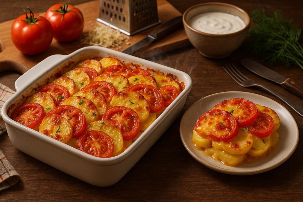 Запечённая картошка с помидорами и сыром — это больше чем ужин, это домашний уют в одной тарелке! Картофель даёт сложные углеводы для энергии, помидоры богаты ликопином для здоровья сердца, сыр поставляет кальций для костей. Сбалансированное блюдо для всей семьи.