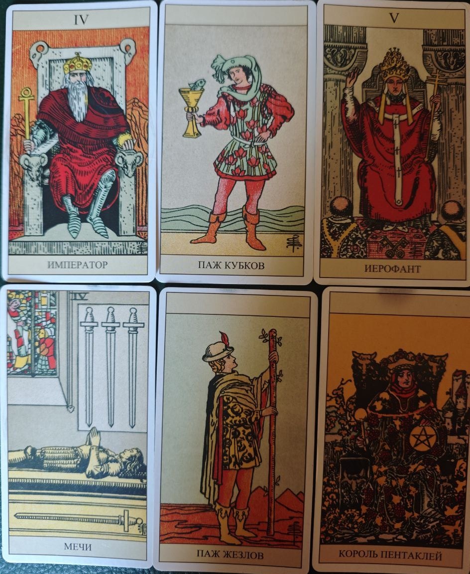 Карты, которые легли на стол: Император, Паж Кубков, Иерофант, 4 Мечей, Паж Жезлов, Король Пентаклей.