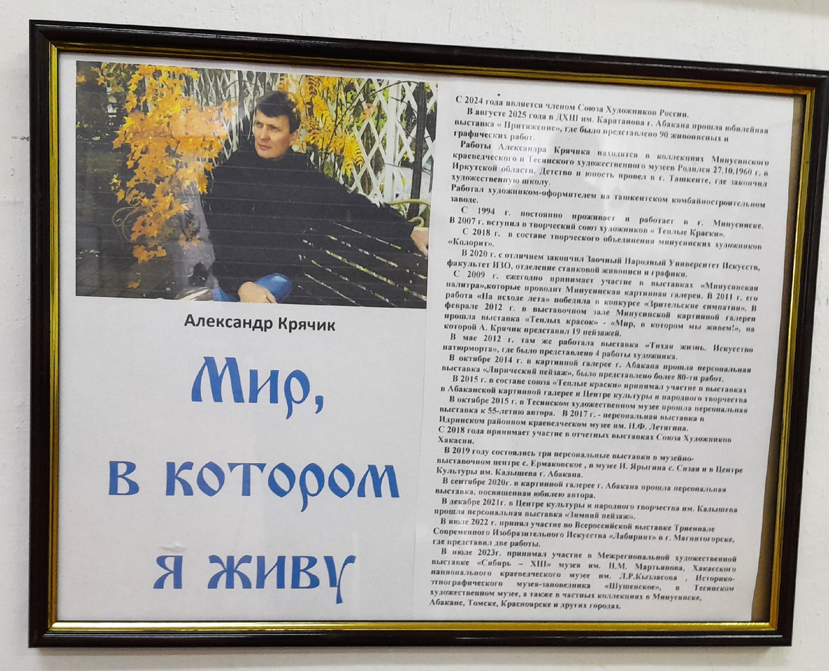 Персональная выставка -- открытие новых миров. Новых местечек географии, горизонтов своих кругозоров, духовно-нравственных состояний души, личных и общественных переоценок... Именно такое событие произошла вчера в Тесинском художественном музее. " Мир, в котором я живу... " -- так обозначил Александр Крячик свою новую персональную выставку. Встреча с ним в ТХМ не первая, но... Очевидно, Мастер прошел долгий путь становления, создавая прекрасные пейзажи, наполненные светом и теплом... В этой экспозиции их -- двадцать. Здесь мы погружаемся в удивительный мир искусства, созданный талантливым мастером кисти и вдохновения. Особое внимание привлекают картины, выполненные в жанре лирического пейзажа, демонстрируя тонкий художественный вкус и умение передавать атмосферу родного края. Среди представленных произведений выделяются полотна «На исходе лета», «Вечер над озером» и «Весенний ветер»... Хотя... На вкус, как говориться, и цвет... Работы этого цикла отличаются нежностью цвета и