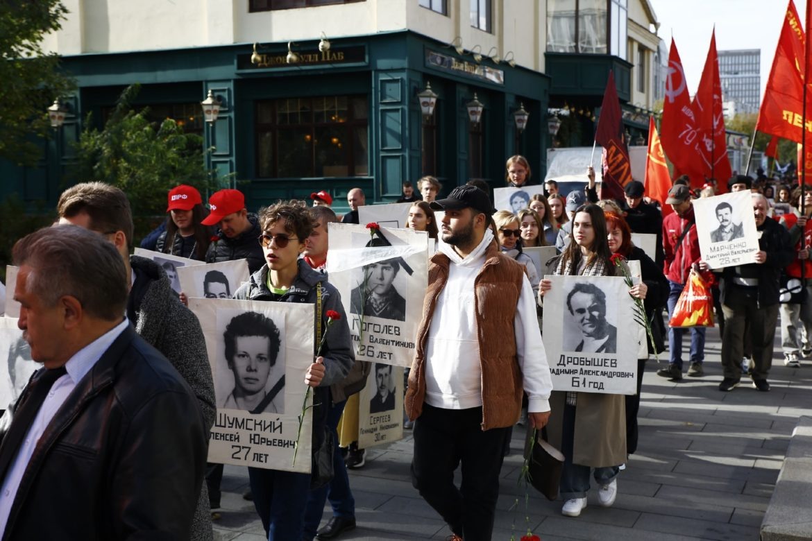 В начале колонны видны транспарант «Их убил режим Ельцина» и портреты погибших — героев тех трагических дней. Разные. Молодые и старые. Веселые и серьезные. Их объединяет время и общая трагическая дата – дата ухода из жизни, которую отдали они за правое дело, защищая Советскую власть, свое будущее. Они погибли, но они живы в сердцах живущих, которые навсегда запомнили те трагические события 1993-го. Лозунги «Нет прощения палачам!» «Террор рожден властью в октябре 1993 года», «Не забудем! Не простим!», «Октябрь 1993 – преступление без срока давности» говорят о том, что возмездие для убийц неотвратимо.