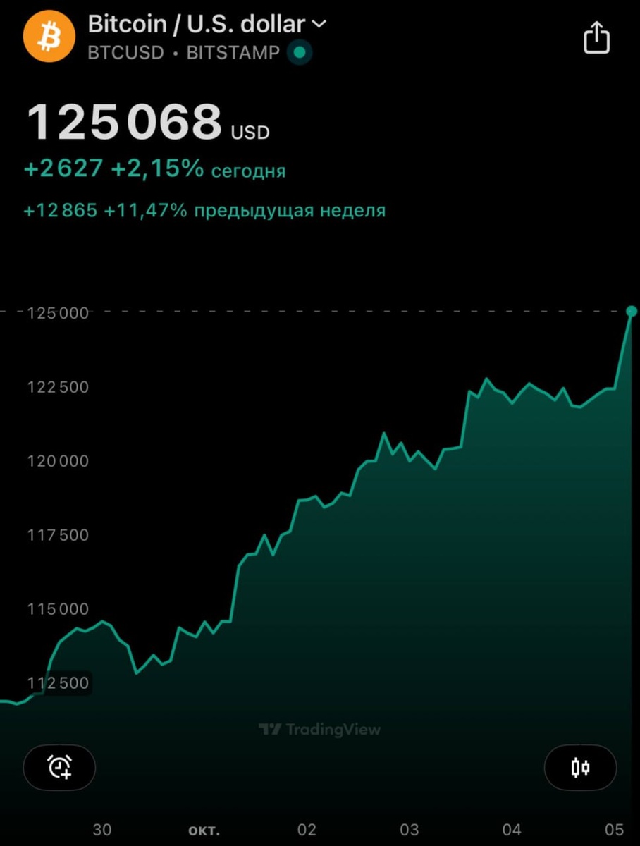 Стоимость биткоина сегодня впервые поднялась выше отметки в $125 тысяч