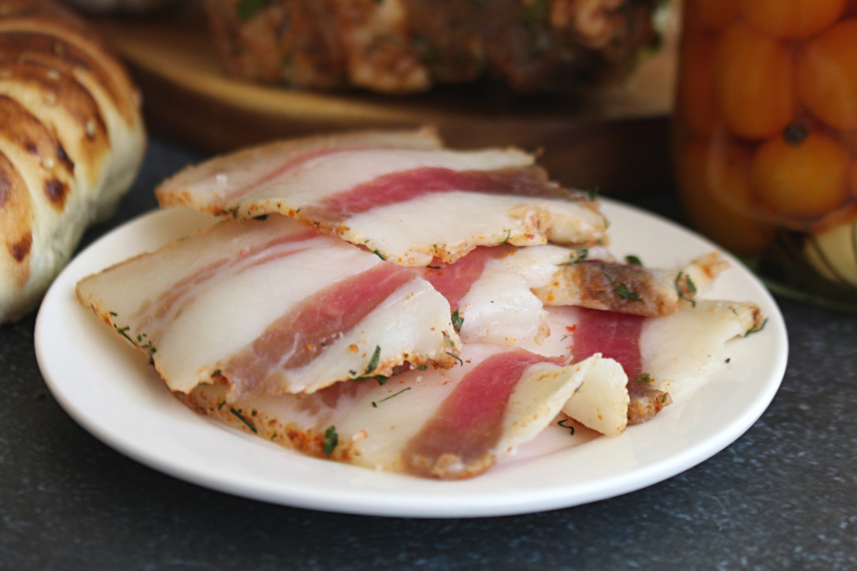 Можно сделать другим способом, оставить сало на сутки при комнатной температуре, а уже потом убрать посуду в холодильник. Я готовое сало убираю из посуды, в которой оно солилось. Оборачиваю сало пергаментом и храню его в морозильной камере. Замороженное сало удобно нарезать очень тонко.