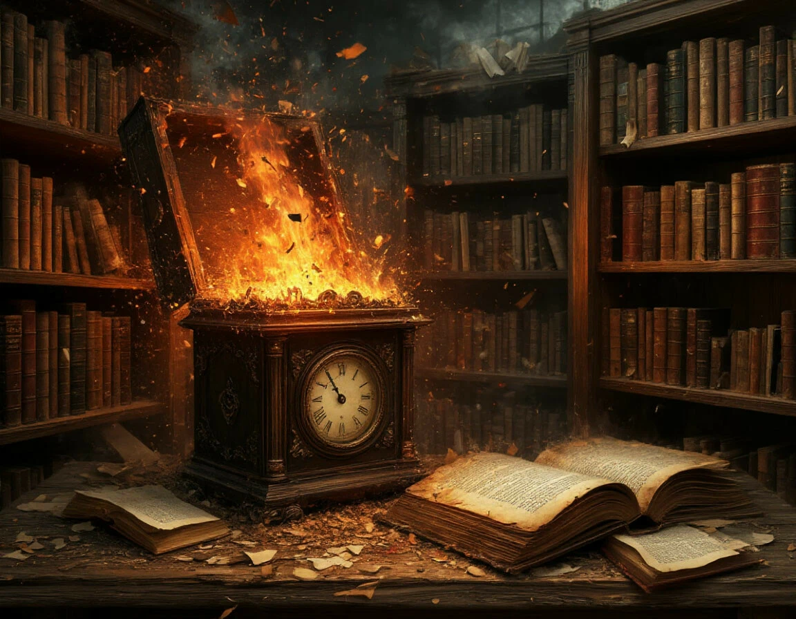 Аглая стояла в центре бури. Она видела, как полки рассыпаются в пыль, как предметы теряют форму, сливаясь в кашу из света, тени, времени и памяти. Сундук поглотил фонарь, но не смог переварить его свет и лопнул, выпустив наружу тьму, смешанную со слепящей вспышкой. Книга сгорела в пламени, которое вырвалось из недр метронома, ускорившего горение до мгновения.