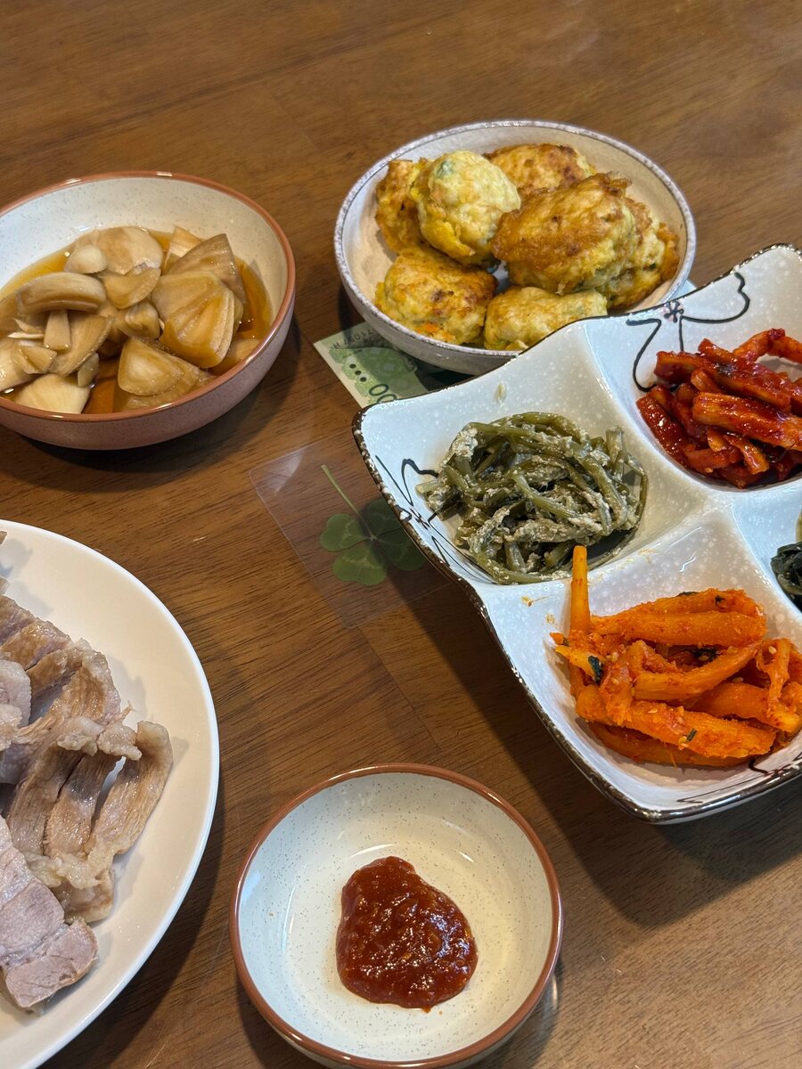 у нас просто пир 👍 вот бы тоже так готовить 😛 столько всего!! я еще не все сфоткала очень много панчанов (закусок) например, красное на первом фото справа - 무말랭이 мумаллэни высушенная редька, мне показалось оочень острой!) лучок маринованный шикарен был, еще яйца перепелиные а вообще приготовили вареное мясо и капусту, приготовленную на пару, еще были котлетки из мяса, овощей, их специально на этот праздник- чусок готовят плюс еще супчик с овощами, грибами, тофу рис конечно!! еще зелени много~ но самый сок - это острый перчик 🫑 самый острый сорт в Корее!! гибрид обычного зелёного перца и очень острого тайского чили, мужчины прям кушали, я обычно не ем, тк очень остро. Тем более после России мне тяжело кушать острое.. но что-то захотелось попробовать.. и мне досталась самая острая часть как будто хахахах прям пожар во рту, начинает гореть все, голова начинает болеть схаха сразу заела супчиком и рисом, плюс запила водой, стало полегче, но не советую ахахах