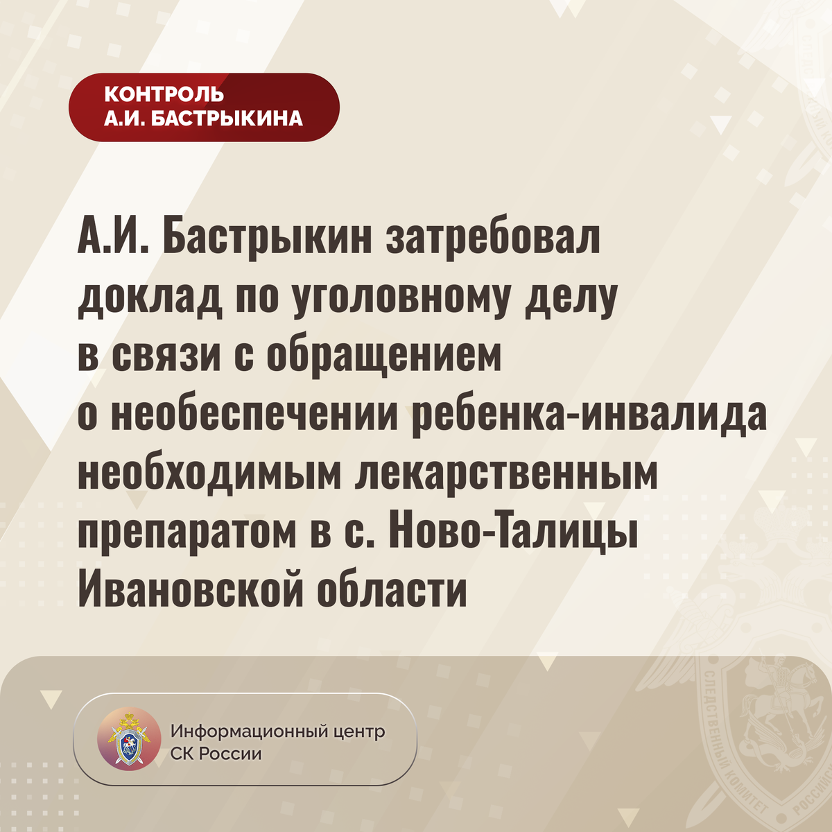 А.И. Бастрыкин затребовал доклад по уголовному делу в связи с обращением о необеспечении ребенка-инвалида необходимым лекарственным препаратом в с. Ново-Талицы Ивановской области В приёмную Председателя СК России А.И. Бастрыкина «ВКонтакте» обратилась жительница села Ново-Талицы Ивановской области по вопросу нарушения прав ее двухлетнего сына-инвалида на качественное медицинское обеспечение. Для поддержания здоровья ребенку, страдающему заболеванием, необходим регулярный прием лекарственного препарата, однако с мая текущего года медикамент мальчику не выдается. При этом матери предлагается аналог, прием которого может негативно сказаться на состоянии здоровья малолетнего. Обращение в профильные структуры результатов не принесло. В СУ СК России по Ивановской области по поступившему обращению организована процессуальная проверка, материалы которой приобщены к расследуемому уголовному делу. Председатель Следственного комитета Российской Федерации Александр Иванович Бастрыкин затребовал у
