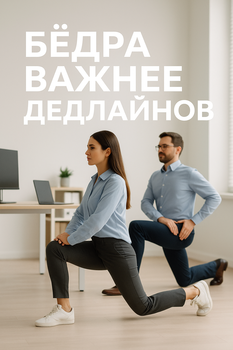 – Что происходит: долгое сидение ослабляет ягодичные мышцы и укорочает сгибатели бедра — нарушается механика движения, растёт нагрузка на поясницу и тазобедренный сустав.