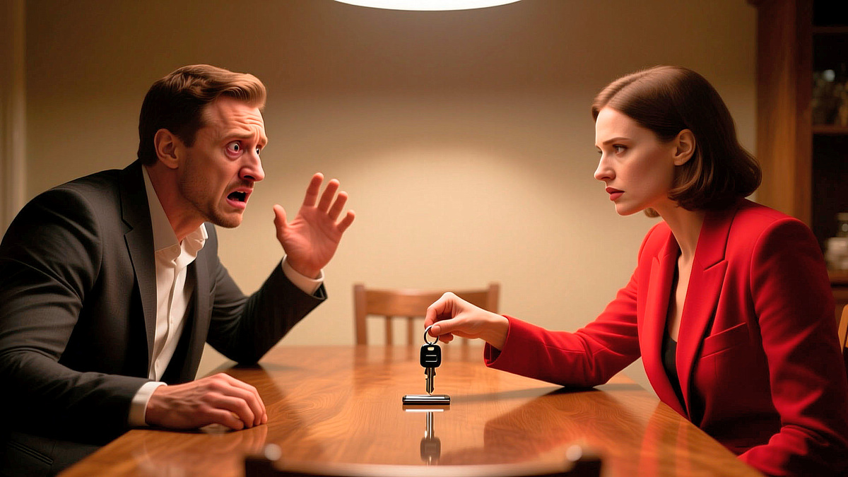 Вадим смотрел на ключ, потом на Юлю, потом снова на ключ. Его лицо вытянулось от изумления. Он явно ожидал чего угодно — истерики, скандала, молчаливых слез. Но не этого. Этого не могло случиться.