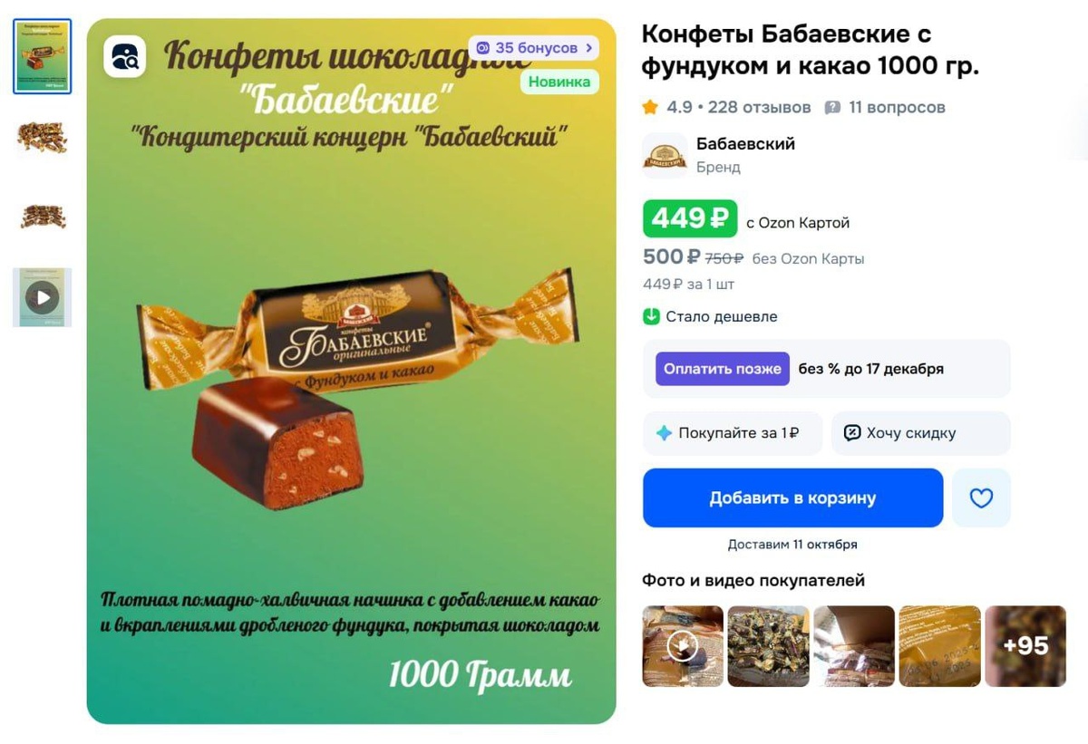 Конфеты Бабаевские с фундуком и какао 1000 г за 449₽ c Ozon Картой
