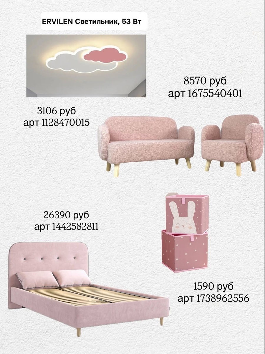 Пудрово-розовая гамма делает детскую по-домашнему тёплой, мягкой и светлой. Такая палитра уместна и для малышей, и для школьников: она не утомляет, поддерживает спокойный ритм и красиво сочетается с деревом, плетёными фактурами и молочными оттенками. Ниже — подробный гид по предметам с фото: каждый элемент разобран по функциям, размерным нюансам и сочетаниям. Все позиции идут по порядку и снабжены артикулами для удобного поиска на «озон».