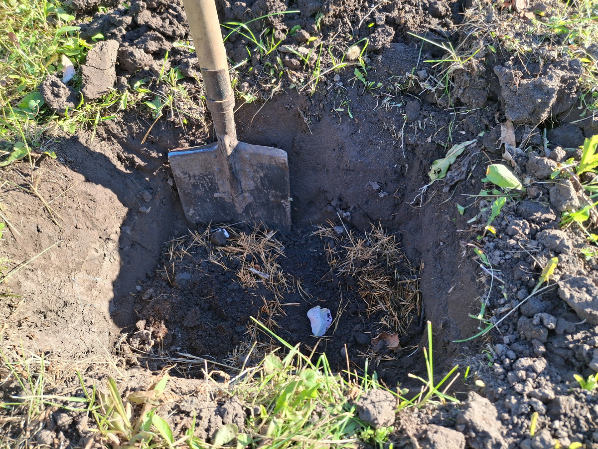 Гортензию в средней полосе России сажают в грунт осенью, за 4- 6 недель до устойчивых морозов. Попалось мне видео в интернете про гортензии. И так захотелось их посадить! До следующего года не дотерплю😁 Заказала в Озоне гортензию Лайм Лайт. Посадила 19 сентября. На канале есть видео. Захотелось еще! Заказала Фантом. 30 сентября приехали на дачу подготовить яму. На случай, если начнутся дожди, чтобы быстренько посадить её. У гортензии поверхностная корневая система, поэтому яма нужна не столько глубокая, сколько широкая. Какую муж выкопал, в такую и буду сажать. Глубина штык лопаты, ширина штык лопаты и длина 2 штыка. На дно - хвойный (еловый) опад. Сверху присыпала грунтом из этой же ямы. Ещё приготовила кислый торф, двойной суперфосфат, калий сернокислый. В яму, примерно, по 1 ст ложке удобрений. Это пойдет задел на следующий год. Грунт из этой же ямы мешаю с кислым торфом. На ведро грунта , три( не знаю, как сказать😁, посмотрите на фото), но скажем 3 горсти торфа. Мешаю в яме. З