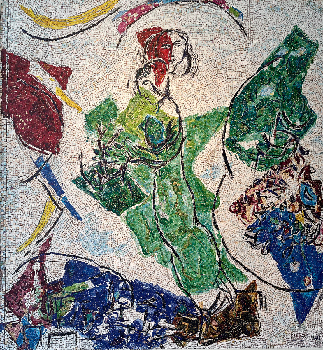 Первая мозаика, созданная Марком Шагалом и Лино Мелано, «Влюблённые», была задумана для Фонда Маг в Сен-Поль-де-Ванс. Фонд, открытый 28 июля 1964 года, возник из дружбы коллекционеров и галеристов Маргарит и Эме Маг с крупнейшими художниками XX века. Эме Маг впервые встретился с Марком Шагалом в октябре 1947 года на вернисаже его ретроспективной выставки в Музее современного искусства города Парижа. Эту выставку организовал Жан Кассу — как акт провокации и одновременно празднования возвращения художника после его лет изгнания в США. «Айда Шагал привела меня познакомиться с отцом, и я был поражён, увидев в его мастерской гуаши, написанные в США и Мексике: шестьдесят великолепных картин, которые мне посчастливилось увезти с собой на улицу Тегеран. Вместе мы разработали планы первой выставки в галерее. Эта встреча стала началом тесного и доверительного сотрудничества и нерушимой дружбы», — вспоминал Маг. Выставка состоялась в марте 1950 года. В том же году Шагал переехал в Ванс, недал