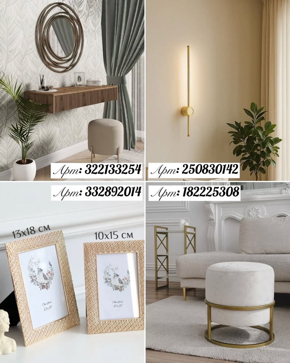 Тёплый металл, молочная база, графичные линии и капля природных фактур — такой рецепт даёт интерьеру ощущение порядка и «дорогого» спокойствия без ремонта. Ниже — продуманная подборка предметов из коллажей. Идём строго по порядку с артикулами: у каждого элемента — характер, польза и мой совет стилиста.