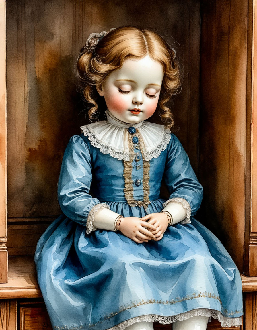 Она сидела на отдельной полке, в стороне от другого антиквариата, в тени. Прелестная фарфоровая кукла в старинном платье цвета выгоревшей лаванды. Ее волосы, тонкие, шелковистые, настоящие, были убраны в сложную прическу. Лицо с нежным румянцем на щеках было исполнено с невероятным, почти пугающим мастерством. Но вот что странно — ее глаза были закрыты. Длинные атласные ресницы лежали на персиковых щечках, словно она спала. Хоть я и не великий знаток игрушек, но с детства помнил, что в положении сидя глазки должны быть открыты. "Интересно, какие они? Должно быть синие!" — подумалось невзначай. В куклах всегда есть что-то тревожное, но эта… Она не была жуткой. Скорее печальной. Глубоко, бездонно печальной.